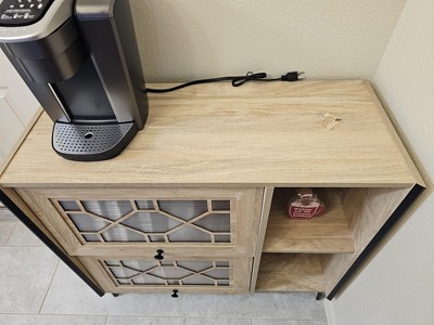 Spacious top, 2 cabinets and 4 shelves for sufficient storage