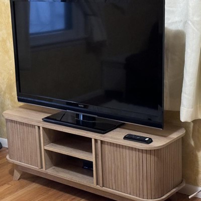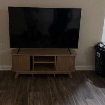 This TV stand is great quality and fits my 55-inch TV perfectly. The sliding door design looks stylish and glides smoothly, making it easy to access storage. Installation was smooth, and the instructions were clear to follow. I appreciate that it even comes with patches to cover the screws for a clean look. It feels solid and can easily hold a good amount of weight. The adjustable shelves making organizing convenient. For the qualit and functionality, this stand is a great value for the prices and adds a modern touch to the room.
