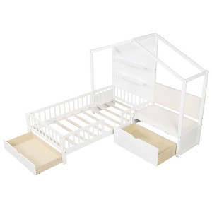 Crafted from breathable linen fabric and elastic sponge, the cozy bedside sofa is perfect for creating a reading nook. The house bed also offers ample storage solutions with floating shelves, an under-bench drawer, and an under-bed drawer. The stable wood structure of the kids bed can hold up to 330 lbs and provides a canvas for personal decorations. The guardrails ensure safety while the wide entrance promises easy access. Setup is hassle-free as the platform bed doesn't require a box spring. The house bed is compatible with a 6" thick mattress. More user-friendly details await your discovery.