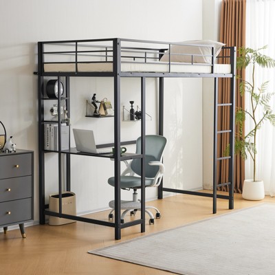 Costway Twin Size Loft Bed w/ Desk & Shelf 2 Ladders & Guard Rail for Kids Teens Bedroom Brown/Grey/White