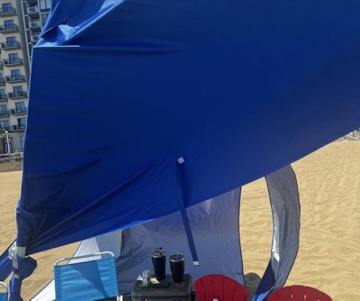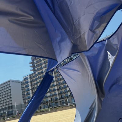 The shipping was timely and efficient and the item arrived earlier than projected, and that's about all I can positively report on this cabana. The material is much thinner than a standard beach umbrella which left several small tears and holes after the first use. The cabana does not hold up to wind, the sand bags and sand anchor work well and the cabana stayed in place. The issue is where the arms that hold open the canopy come together. The hub that the arms are connected to is a white piece of very soft plastic, a top and bottom screwed together. A metal ring runs through the end of each arm and is held together by the hub. The ring acts as a hinge which allows the cabana to open and close. The ring is one continuous piece with an open ended joint which ends up being the weak point, any external pressure ie: wind causes one of the open ends to pull out of the hub and release one of the arms. When the arm releases and the cabana is open the arm tears through the cabana material. This happened 2 days in a row in 10 mph winds. The corners of the cabana where the arms attach to the cabana itself is tearing at the seams after 4 days of use.