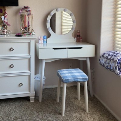 Get up in the morning and start the day with our perfect makeup.If you're looking for a unique dresser, don't miss this amazing vanity table with lights. This is our elegant and simple dressing table with round mirrors and cushioned stools. Made of high quality P2 MDF and solid wood,sturdy construction with 100% solid wood legs to ensure the enough support, resulting in a long use time. Soft cushioned stool brings great comfort and relieves fatigue during long periods of make up.The grid cushioned cover can be removed for easy clean. We provide 11 LED bright bulbs, 3 of which are spare.The power plug is UL certified for safe use. The large and high-definition mirror with 8 bulbs gives you a clear, bright makeup experience in low-light environments. Of course,the upper part of the dresser can be removed and used as a writing table. The wide desktop and 2 large drawers with smooth slide rails provide enough storage space for your daily needs. Simple design can match the decoration style of any room, ideal to be placed in small spaces. Our products are competitive and won't let you down.