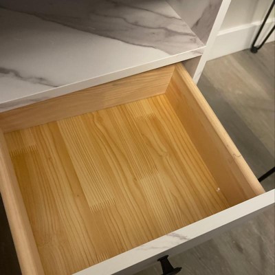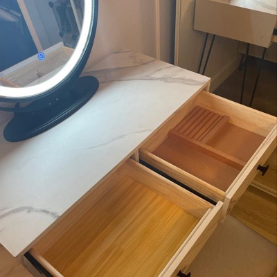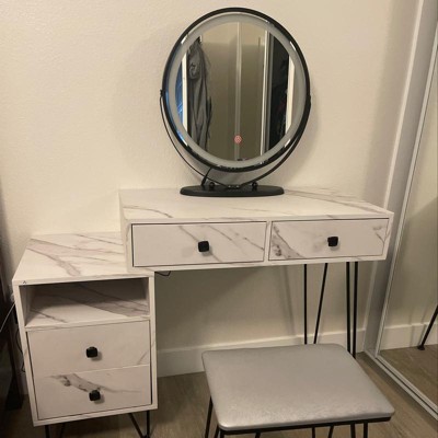 Definitely love the marble look on this vanity table. Set up everything to find out i’m missing one whole pack of screws for the very last part. Kind of disappointed about that. Plus the packaging was not secured well, I was looking forward for this!