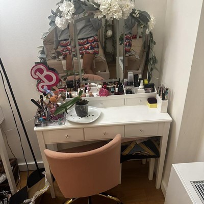 I’m a big fan of this vanity! Bought it on sale and it was def worth it. The materials are really good quality and there’s a major difference between this one vs a particle board one/cheap Wayfair/Amazon one. Assembly was really easy and I did it by myself in maybe 30 mins. The drawers are great and the desk is a great height even for someone as tall as me (5’9”). The free space vanity top isn’t huge but I was more concerned with a place to store my makeup palettes, highlighter, etc., of which there is plenty of space. And def has enough space for doing your makeup. The only time I have issues is when I try to spread out 5-6 palettes at once. 4 will fit fine. The vanity is decently narrow but it’s exactly what I wanted to fit in a narrow space. 3 mild cons that aren’t deal breakers I.e. I would still buy again 1. My legs barely fit under the desk when sitting on the stool. The desk rests on my thighs, so that if I move too much, the whole deal gets picked up by my legs and moves. However, I added another lower chair and it’s fine. 2. The plug in cord for the mirror could be longer. It’s probably 6-7 ft long which is perfectly fine if you’re near an outlet but is less viable if your vanity would need to be further away from an outlet. 3. Like some other reviews said, the light isn’t that bright. It’s decent and better than nothing but not amazing. Added pics but it’s difficult to see the light changes.