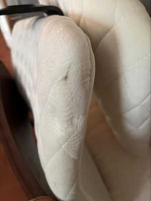Love how cushy the chair is and the orange velvety material is so soft! Did have some slight damage on the wooden arms, so it wasn't perfect. Overall a great buy, though!