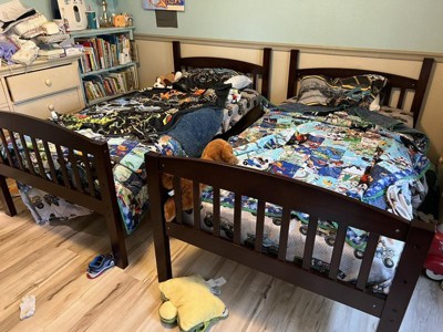 Great, sturdy beds. Assembly took time and patience, but I’ve had the beds for over a year, and they have stood up to all sorts of four year old boy shenanigans. They look nice and go with most espresso colored furniture. As the parent, I’ve even slept in the beds many times. Great support and comfort even without box spring. I haven’t configured them as bunk beds yet. Planning on buying again for guest bedroom.