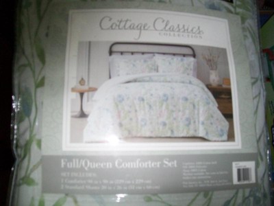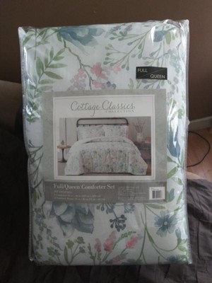 [This review was collected as part of a promotion.] My review is on the Cottage Classics Field Floral 3 Piece Full/Queen Comforter Set. It came with a full/queen comforter, and two standard shams. It fits my bed really well and adds a little bit of color and spring to my bedroom. It makes my room look allot larger than the dark blue colors that I had it there before. The comforter is made of 100% Cotton shell and 100% polyester filling. The shams are made of 100% Cotton, and they are all machine washable. I would recommend this comforter to anyone who wants a nice machine washable cover for your bed.