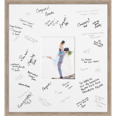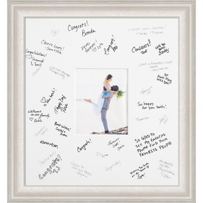 Preserve memories with this conservation-grade signature matboard and handmade frame. Double-thick matboard with a 7 inch width all around the opening holds 50-100 guest signatures and is protected with a UV-resistant sheet of framing acrylic, which shields your signatures and photo from harmful light damage more than traditional glass. Simply open the frame, remove the acrylic, place the mat in the frame for signing in order to assure signatures are fully visible, then replace the acrylic before hanging on the wall. Individually made using traditional custom framing techniques, it has the quality you would expect from your local frame shop and displays your keepsake with premium finishing that can be appreciated up close. BONUS MAT SAMPLE included to test different pens for use prior to signing. Choose pens carefully for fade resistance and the desired look.