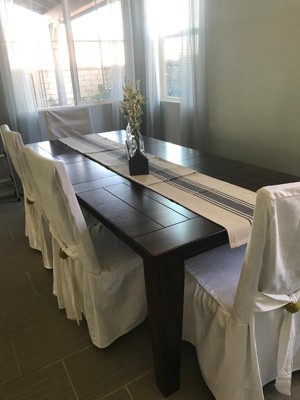 These fit our padded parson chairs very well and have accomplished what I need - an inexpensive update to old chairs. The slipcover look is really cute! I plan to spray them with a stain guard to protect them from our kids. These are new so no comment on durability yet.