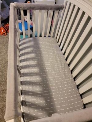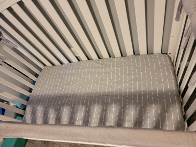 This Fitted Crib Sheet from cloud island™ is suitable for standard cribs and toddler beds. Made from 100% percale cotton with a soft finish, the standard crib sheet fits a six-inch mattress and is designed with all-around elastic for a secure fit. It's decked out in an allover white arrow print on a gray background to give your baby's nursery decor a timeless update.