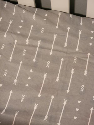A: The crib sheet features an allover white arrow print on a gray background.