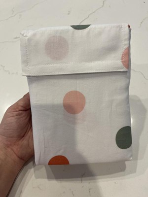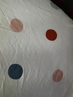 A: The sheet features vibrant polka dots on a white background, adding a bright look to the nursery.