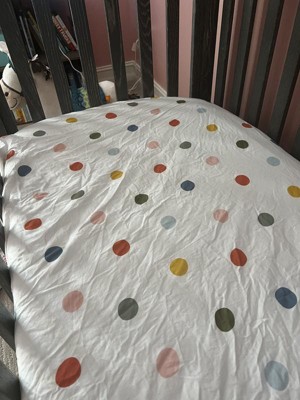 This cotton fitted crib sheet is such a beautiful addition to any nursery. The material is so soft and has such fun colored dots. This sheet washes very well and retains its vibrant colors. My daughter loves naming all the colored dots!