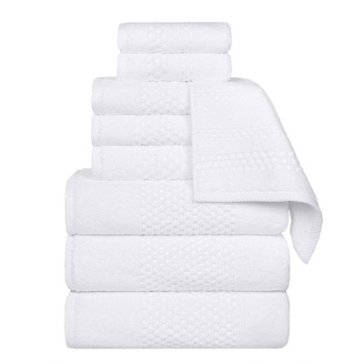 Revamp your bathroom style with the hotel-quality comforts of the Cotton Diamond Dobby Border Ultra-Plush 9 Piece Towel Set by Blue Nile Mills. Our Giza cotton towels feature impressive absorbency, a smooth texture, and silky feel for a luxury spa-like experience at home. The heavyweight thickness of each towel is durable and perfect for the bath, poolside, or at the beach. For a refined finish, each piece in this bundle features an elegant diamond dobby border and a hanging loop for effortless drying. These towels are available in Navy Blue, Charcoal, Chocolate, White/ Black, White, Ivory, Platinum, Gold, and Forest Green color options to match your bathroom decor style. This set includes 3 face towel/ washcloths, 3 hand towels, and 3 bath towels to complete your bathroom essentials.