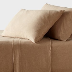 A: I don't think thread count applies to knit fabrics. Comparing weights might help you: Threshold jersey knit full set: 76 oz. Threshold performance sateen (400 TC) full set: 74 oz.
