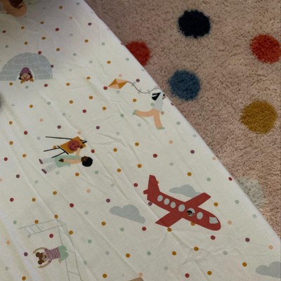 These twin sheets have the cutest pattern. It's a mix of polka dots, airplanes, children doing crafts and more! Very colorful and fun design. Perfect for a kid's room. The sheets are soft and easy to clean. This set comes with a fitted sheet, flat sheet and a pillowcase, which is great value for the price! Highly recommend for a child who likes colorful bedding.