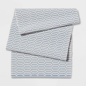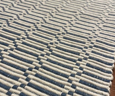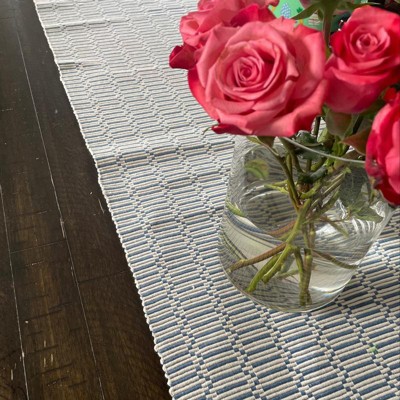 A: The table runner features a blue and white ribbed pattern for a modern look.