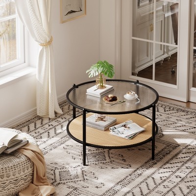 coucheta 30" Round Coffee Table with Storage Shelf, Modern Simple 2 Tier Boho Glass Top Metal Circular Center Table, for Living Room, Balcony, Black