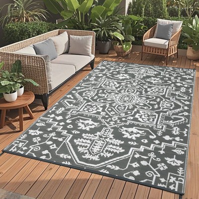 Coucheta 5x8ft Outdoor Rug Reversible Waterproof Patio Rug for Camping, Picnic & Backyard - Grey White Geometric Design,Blue