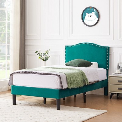 Coucheta Green Queen Bed Frame Upholstered Platform Bed with Velvet Headboard, Non-Slip and Noise-Free/Wooden Slats Support/No Box Spring Needed