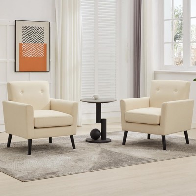 Coucheta Linen Upholstered Accent Chairs, Mid-Century Modern Armchair w/ Wood Leg & Rattan Decor, Lounge Side Chair for Living & Waiting Room,Bedroom