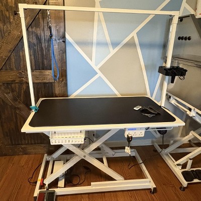Table comes mostly put together and easy to assemble. The caddy’s are super helpful to help organize tools as well. Only downside I have is that the bar is too short for xl large breed dogs but that’s an easy fix if you can afford a new bar. I personally prefer larger holes in the top bar as well to accommodate different brands of loops such as alpha grooming products.