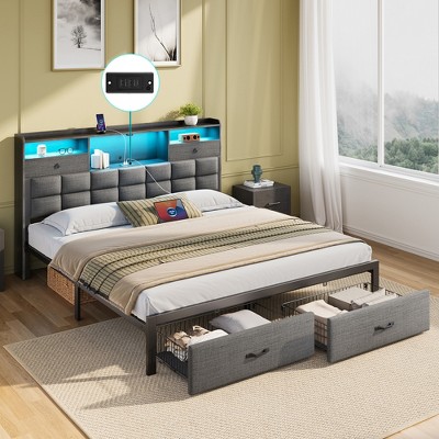 coucheta Bed Frame with Upholstered Headboard and Storage, Drawers Platform Bed with Charging Station, Metal Slats Support, No Box Spring Needed