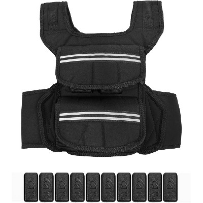 25 LBS ADJUSTABLE WEIGHTED VEST: The vest itself weights 3 LBS and there are 10 iron weights in the package ,each one weights 2.2 LBS. The max weight can be up to 25 LB.