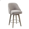 Description Beautifully crafted, the Madison Park Pearce Counter Stool with Swivel Seat introduces a perfect blend of simplicity and sophistication. This barrel style counter stool features a swivel function, allowing you to easily rotate the upholstered seat. A smooth reclaimed grey finish on the rubber wood legs creates a clean transitional look, while a matte metal ring provides the perfect footrest. The smooth and graceful curves of this counter stool form an elegant silhouette that adds a handsome touch to your dining room. Assembly is required. Max weight capacity: 300 lbs. Product Details See below 1 Counter Stool:20inW x 23inD x 38.5inH Seat Dimension:19inW x 18.5inD x 25.75inH Seat Cushion Thickness:4.25in Legs Upper Size:1.75inW x 1.375inD Legs Bottom Size:1.125inW x 1inD Legs Height:21.25in Distance Between Legs(Front-Front):14.75in Distance Between Legs(Front-Back):14.75in Distance Between Legs(Back-Back):14.75in Footrest Height:7in Back Rest Size:17.5inW x 12.75inH Maximum Weight Capacity:300Lbs Material Frame Composition: Solid wood and plywood Leg Material: Solid wood, metal ring footrest Wood Finish: Reclaimed grey smooth Metal Finish: Matte silver Fabrication: 92% polyester, 8% linen Cushion or Upholstery Fill Material: Foam Back Fill Material: Foam