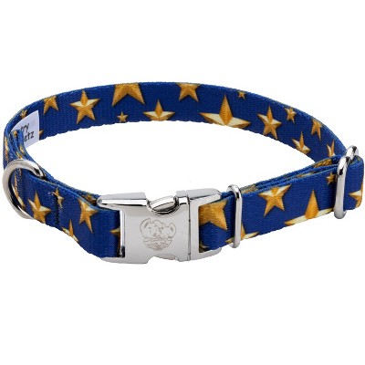 Duty, honor, country: Those hallowed words, famously invoked by General MacArthur, reverently dictate what you ought to be, what you can be, and what you will be. While attempting to embody that spirit of service and sacrifice born by generations of military families, we designed this pattern with gold stars on a deep blue background. At the heart of this exceptional collar lies our premium polyester webbing, a high-strength and resilient material known for its remarkable durability. Whether your dog is a spirited explorer or a playful companion, this collar can withstand the test of time and keep up with their boundless energy. The sleek and smooth texture of the polyester webbing ensures a gentle touch against your dog's neck, eliminating any discomfort or irritation. Your loyal companion will revel in the luxurious comfort that this collar provides, allowing them to strut their stuff with unmatched confidence. To further elevate the collar's functionality, we constructed it with YKK brand buckles, renowned for their exceptional quality and reliability. These buckles are not only stylish but also incredibly secure, giving you peace of mind knowing that your furry friend is always safe and sound. The YKK brand buckles are engineered with precision, featuring a seamless interlocking mechanism that guarantees a secure fit. They are easy to use and offer a hassle-free experience, allowing you to fasten and release the collar with a simple snap effortlessly. Whether you're preparing for a leisurely stroll or an exciting outdoor adventure, this collar ensures quick and convenient handling. Besides its undeniable elegance, our Deluxe Dog Collar is also equipped with a sturdy welded D-ring for easy leash attachment. This feature guarantees a seamless transition from playtime to outdoor walks, allowing you to maintain control without compromising on style or comfort. Please note that while the Extra Small, 2XS, and 3XS sizes may seem delicate, they are still reliable with an impressive 700 lb. tensile strength Indulge your furry friend in the opulence they deserve with our Deluxe Dog Collar. From the premium polyester webbing to the renowned YKK brand buckles, every aspect of this collar is a testament to superior craftsmanship and unparalleled quality made right here in America. Give your loyal companion the gift of comfort and style, and watch them turn heads wherever they go.
