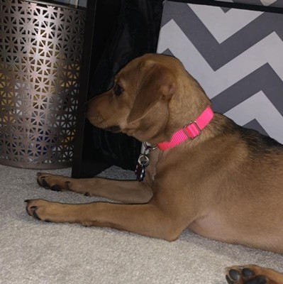 This is a good quality collar and I’m in love with the hot pink. My pup is 5 months and a small worked for her! I will definitely be buying other colors to switch up color coordination with her harness.