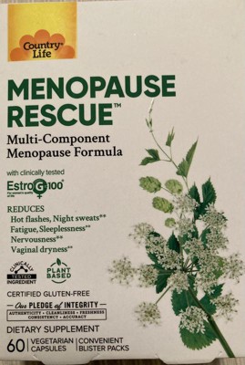 Multi-Component Menopause Formula With Clinically Tested Estro G -100® For Women's Quality of Life Clinically Tested Ingredient Plant Based Certified Gluten Free Dietary Supplement Convenient Blister Packs Low Energy Quality of Life Certified B Corporation Kosher Reduces : Hot Flashes, Night Sweats Fatigue, Sleeplessness Nervousness Vaginal Dryness — Our Pledge of Integrity — Authenticity Cleanliness Freshness Consistency Accuracy Did you know? Country Life's safe menopause formula with clinically tested ingredients provides complete care of major menopausal symptoms. EstroG-100® is a standardized botanical root extract that helps reduce the symptoms associated with menopause, while Lifenol® hops flower extract improves the quality of life in menopausal women. Don't let menopause control your life! Country Life's Menopause Rescue™ is a multi-symptom formula that combines key clinically tested ingredients to help reduce the major dreadful symptoms of menopause and helps improve the quality of life of menopausal women. Feel full of life again! #Poweryourgreatness™ YES Certified Gluten-Free by GFCO.org NO Yeast, Wheat or Soy YES Certified Vegetarian by The AVA NO Milk or Salt YES Recyclable Packaging NO Preservatives YES Manufacturing Supports Wind Power NO Artificial Colors, Flavors or Sweeteners YES Kosher NO GMOS