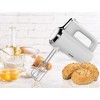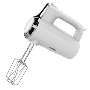 The Courant 250W 5-Speed Hand Mixer in a stylish white finish - the perfect addition to any kitchen! With 5 easy-slide mixing speeds, this mixer accommodates all your favorite recipes. The powerful 250-watt motor handles all your baking needs, while the turbo power function provides max speed for tough mixing tasks. Cleanup is a breeze with the eject button, allowing the beaters and hooks to eject easily with the push of a button. And when you're done, simply place the attachments in the dishwasher for hassle-free cleaning. Upgrade your baking game with the Courant 250W 5-Speed Hand Mixer - the perfect combination of style and function.
