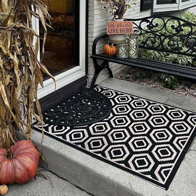 Eurika, finally a clean and simple black and cream design rug! Great size options in all colors, durable thick material (last one lasted me 5 years of heavy use at the front door), cleans easy with a broom for dry light debris otherwise use a power washer to get the seasons green gunk out and it looks brand new.
