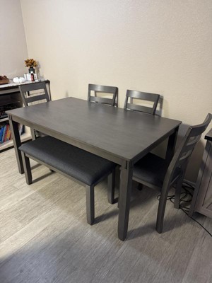 We loved the simplicity and rich dark color of the set. Its size is perfect for our small dining area and the faux leather seat cover makes it easy to clean kids' mess. The bench seat can be placed under the table to save space when not in use. However, after few months of use, one of the chairs tipped accidentally and the wood broke. As mentioned by other reviewers, the wood is of poor quality and could not withstand a single fall. Very disappointed and concerned with the quality of material considering that the chairs of our previous dining set (that is currently used in Kitchen) have undergone several falls and moves without a single chip.