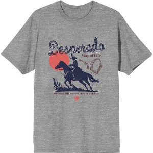 - Custom Design: Channel your inner cowboy with this western-themed apparel featuring a big, colorful graphic of "Desperado" in rope font alongside a cowboy riding his horse into the sunset - an eye-catching image that has been professionally printed for long-lasting print quality.