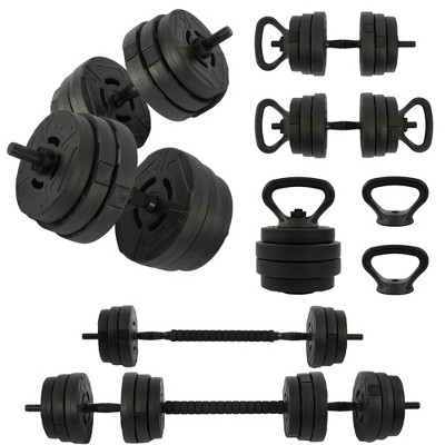 This versatile 4-in-1 adjustable dumbbell set provides 88 pounds of free weights with included connectors to function as kettlebells, a barbell, push-up stands, or traditional dumbbells. Designed as comprehensive fitness equipment for home gyms, it offers multiple workout configurations in one space-saving system. The durable construction supports various strength training exercises for full-body conditioning.