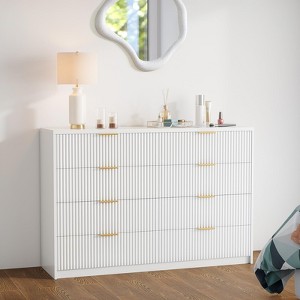 The COZONY 55" Fluted Dresser offers modern elegance with its grooved panels and metal handles. This versatile dresser features 8 spacious drawers for storing clothing or accessories and can also serve as a stylish TV stand. Easy assembly with customer support for a smooth experience.