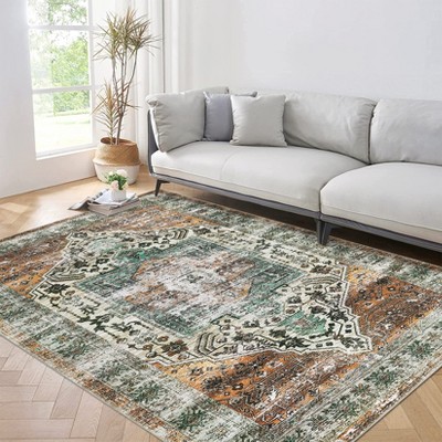 COZONY 8' x 10' Modern Bordered Entryway Rug, Washable Non-Slip Low-Pile Runner Carpet with Floral Print for Hallway, Kitchen & Bathroom, Beige