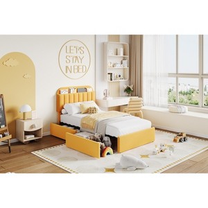 This functional kids platform bed combines a practical storage headboard with two smooth-rolling drawers for organized and clothing storage. The noise-free bedframe features sturdy construction that requires no box spring, providing a safe and quiet sleeping environment. Designed specifically for children's needs, this bed offers both playful functionality and lasting durability.