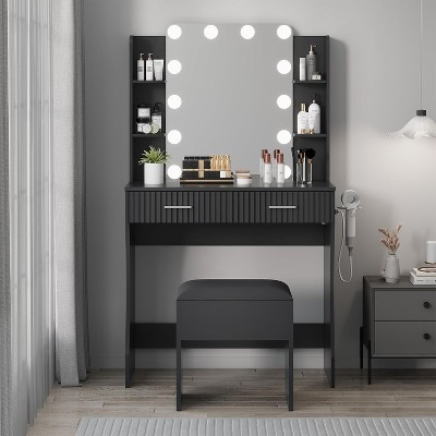 COZONY Makeup Vanity with Lights & Mirror, Vanity Table with Charging Station, Hair Dryer Holder, Storage Drawers & Shelves, Upholstered Stool