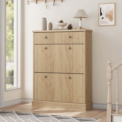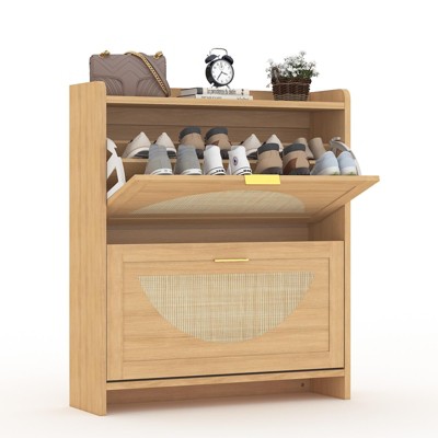 Organize footwear at your entryway with the COZONY Rattan Shoe Cabinet. This slim, freestanding cabinet features woven rattan door fronts and an open bottom shelf. Inside, two shelves can be adjusted to create space for different shoe styles. The cabinet's narrow design aims to fit in limited floor spaces like hallways or closets while offering multiple tiers of storage. Assembly is required for this piece, designed for use in entryways, hallways, or bedrooms.