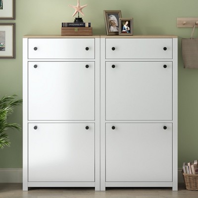 COZONY Shoe Cabinet with 2 Flip-Down Drawers, Narrow Freestanding Hidden Storage Organizer with Hooks for Entryway, Hallway, Garage