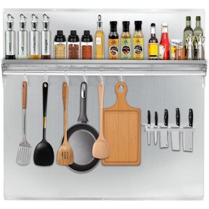 This professional-grade stainless steel backsplash panel features an integrated storage shelf and knife rack for optimal kitchen organization. The heat and grease-resistant surface is easy to clean while the pre-drilled design allows quick installation behind stoves or range hoods. The durable stainless steel construction withstands kitchen conditions while providing functional storage for cooking tools. Serves as both protective backsplash and efficient organizer in one space-saving unit. Perfect for commercial and residential kitchens seeking both practicality and professional appearance.