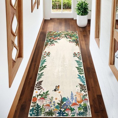 This animal print kitchen runner features a soft, non-slip surface that ensures safety in high-traffic areas. Designed with a forest-inspired pattern and stain-resistant technology, it maintains its appearance even with frequent use. The washable construction allows for easy cleaning, making it ideal for entryways, hallways, laundry rooms, bathrooms, and bedside areas.