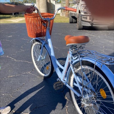 Experience comfortable and effortless riding with this women's 1-speed step-through beach cruiser bike. Designed for leisurely rides and daily commutes, it features a convenient front basket for carrying personal items and an adjustable seat to fit various heights. The step-through frame allows for easy mounting and dismounting, while the classic cruiser styling offers timeless appeal. Perfect for beach paths, neighborhood rides, or casual commuting, this bicycle combines comfort, functionality, and style for everyday cycling enjoyment.