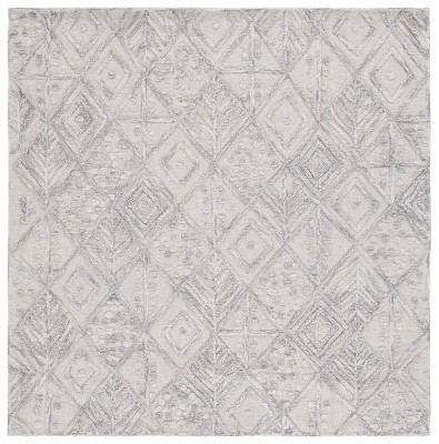 A: The rug features an abstract art pattern with irregular color blocks and lines.