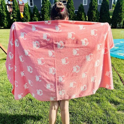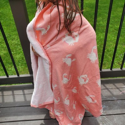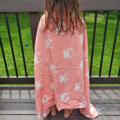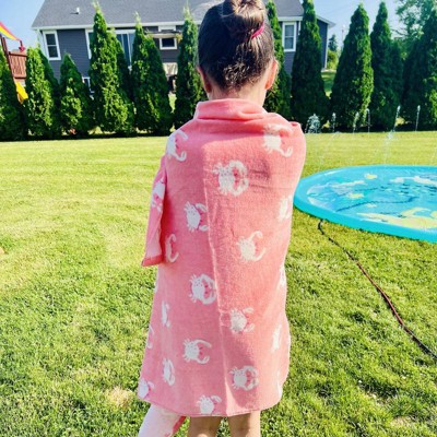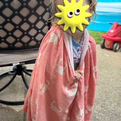 This beach towel is the perfect size to wrap yourself up in or lay on. My daughter and i think the coral color and crab designs are really cute. This beach towel is also really very soft even after multiple washes.