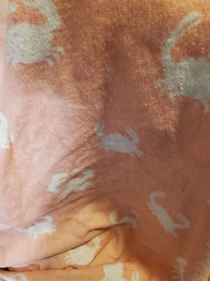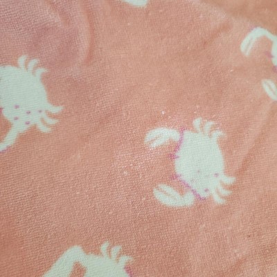 This is an absolutely adorable towel. The crabs have a little, tiny bit of pink around them, to give them a little dimension. The towel itself is really soft on the coral side. It's almost a neutral color so it can go with many different swimsuits.