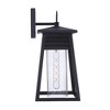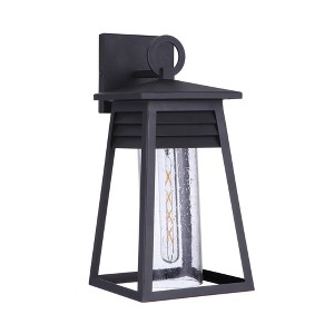 The Becca collection delivers a casual coastal aesthetic with louvered detail reminiscent of resort plantation shutters, clear seeded glass and strong silhouettes finished in Textured Matte Black with our superior UV finish guaranteed for 5 years against 1 Year Fixture/5 Years Finish Shade Included: Yes Dimmable: Yes Material: Glass, Finish Color: Textured Black, Width: 7.75", Height: 15.87", Length: 7.75", Depth: 8.5", Height From Outlet Box: 2.56", Backplate Width: 5.12", Backplate Length: 5.12", Number Of Bulbs: 1, Wattage: 60 Watts, Dimmable: No, Moisture Rating: Wet Rated